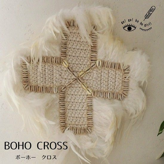 4. 約40cm かぎ針編みとシェル、羽使いがおしゃれなクロスモチーフ壁飾り【-BO! HO! GIRL! GO! GO!-】 <ボーホークロス>