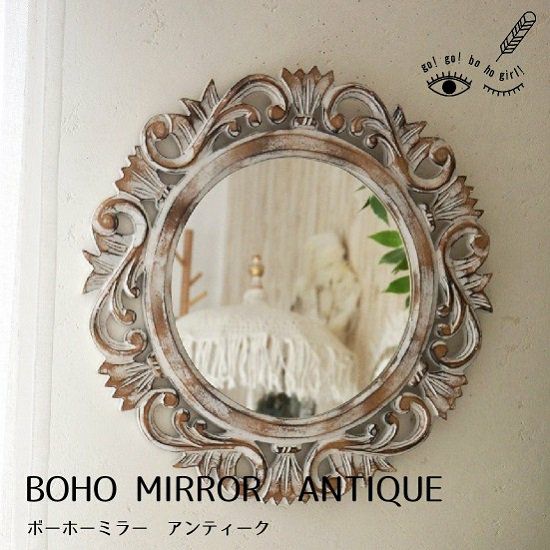 直径約40cm アルベシアウッドの軽量ウォールミラー 【-BO! HO! GIRL! GO! GO!-】 <ボーホーミラー アンティーク>