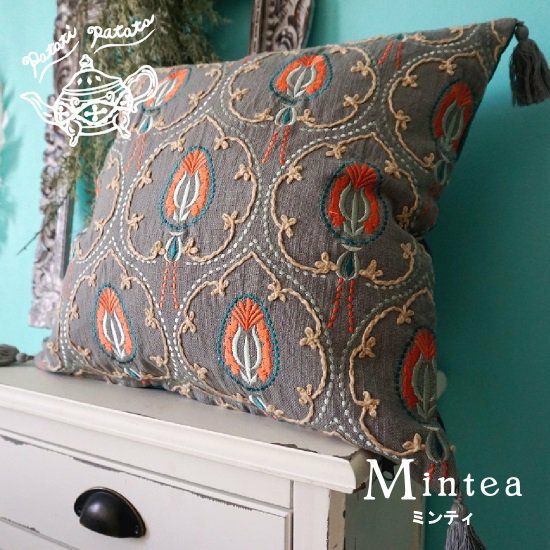 【 Patati Patata クッションカバー 】 45x45cm 刺繍とタッセルが魅力のおしゃれなクッションカバー・ファスナー付き<ミンティ クッション>