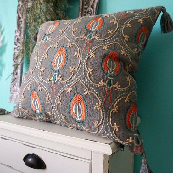 刺繍とタッセルが絶妙なカラーバランスであしらわれたおしゃれなクッションカバー。 モロッカンなカラーで、お部屋を素敵にコーディネートしてみませんか?