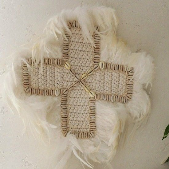 4. 約40cm かぎ針編みとシェル、羽使いがおしゃれなクロスモチーフ壁飾り【-BO! HO! GIRL! GO! GO!-】 <ボーホークロス>
