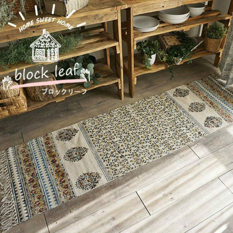 5. ナチュラルでおしゃれなデザインのブロックハンドプリントキッチンマット【HOME SWEET HOME】<block leaf ブロックリーフ>50×170cm・50×240cm:2サイズ