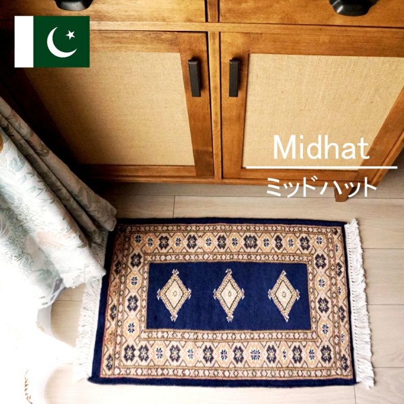 5. 【緞通】世界に1つだけ!高級手織りパキスタン緞通マットサイズ<ミッドハット ネイビー>:約69x47cm