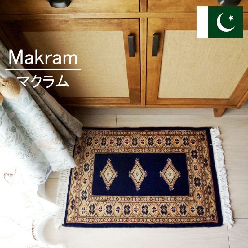 約47x68cm 【緞通】世界に1つだけ!高級手織りパキスタン緞通マットサイズ<マクラム ネイビー>:約47x68cm