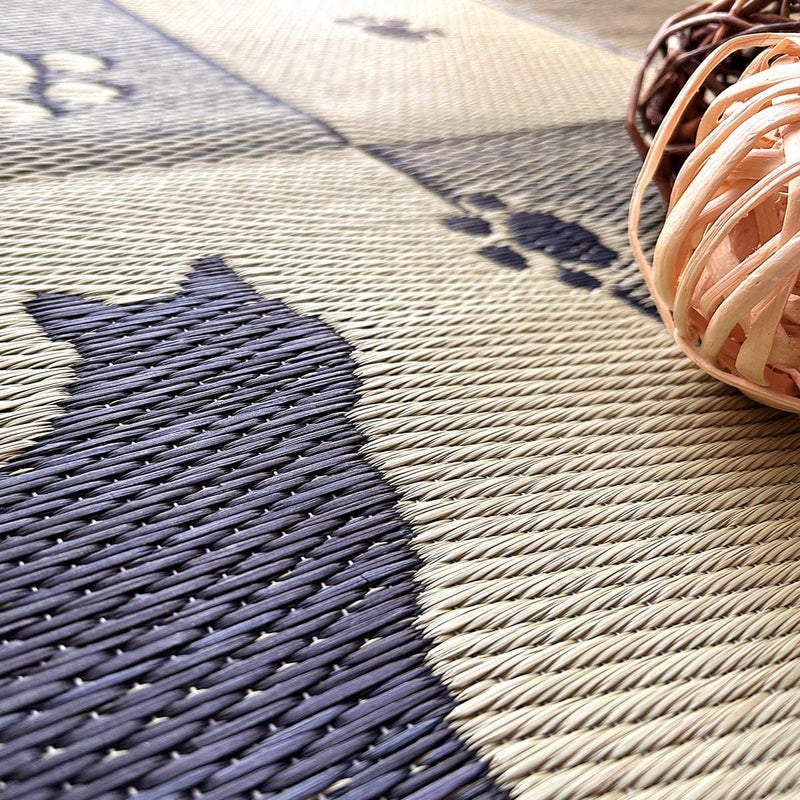 4. キャットウォークで戯れる猫ちゃんがデザインされたい草ラグ<たわむれ ブラック>:2サイズ