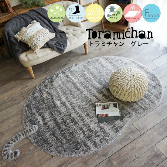 ネコ型の消臭・防ダニ高機能ラグ かわいいフォルム!しっぽ付き<-Toramichan-トラミチャン グレー>:130×185cm
