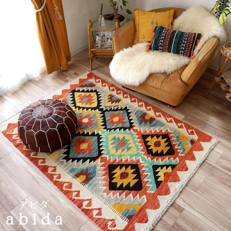 キリムは薄くて軽量なので、女性一人でも扱いやすいラグです。