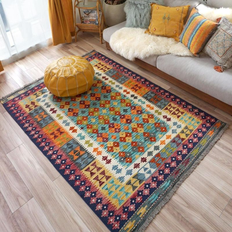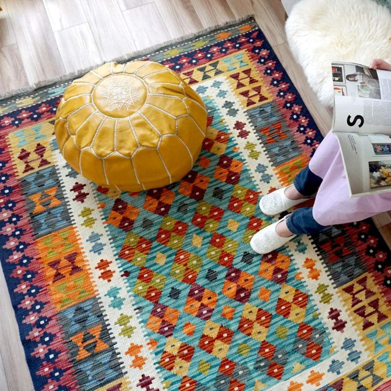 キリムは薄くて軽量なので、女性一人でも扱いやすいラグです。