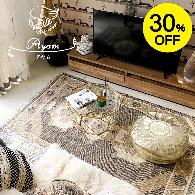 ジュートの素材感とエジプトの古代文明や神話の世界観を存分に楽しめるラグです。