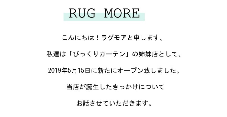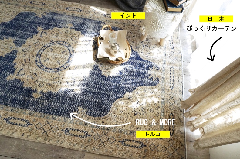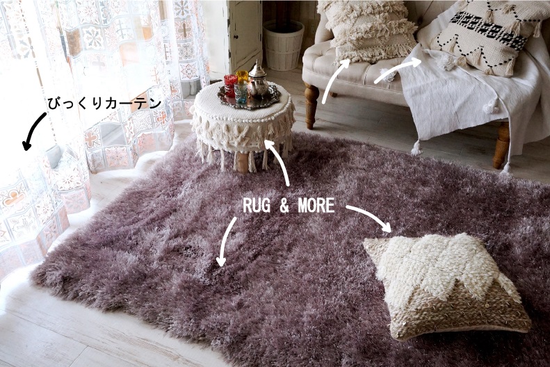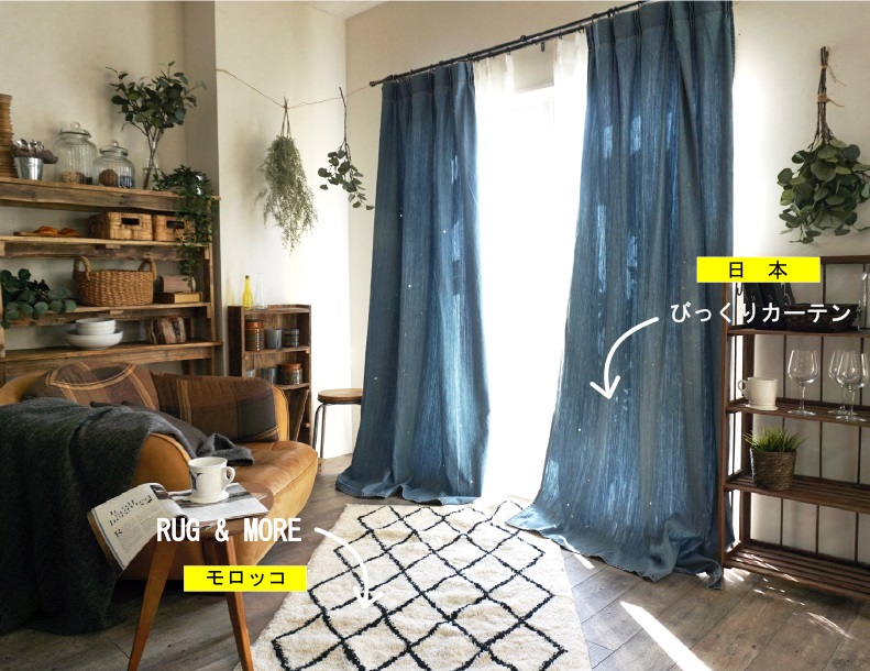 当店で販売中のラグのお写真に写り込んでいる素敵なカーテン、 よくお問合せをいただきますが、これらはすべて「びっくりカーテン」 で販売中のカーテンです。