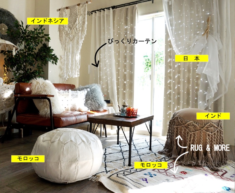 姉妹店の「びっくりカーテン」と「ラグモア」のアイテムを組み合わせればお部屋のコーディネートも自由自在。