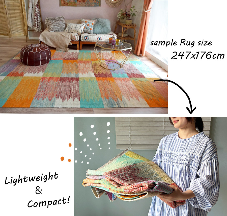 キリムは薄くて軽量なので、女性一人でも扱いやすいラグです。