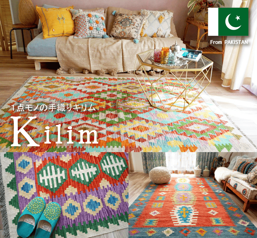 すべて1点モノ!大胆なデザイン&色彩の遊び心が楽しめる手織りのキリムラグ