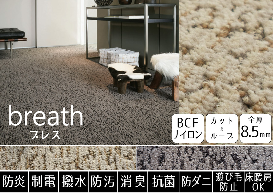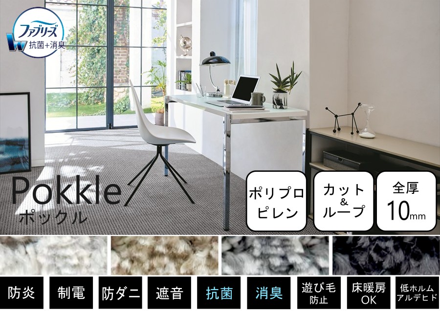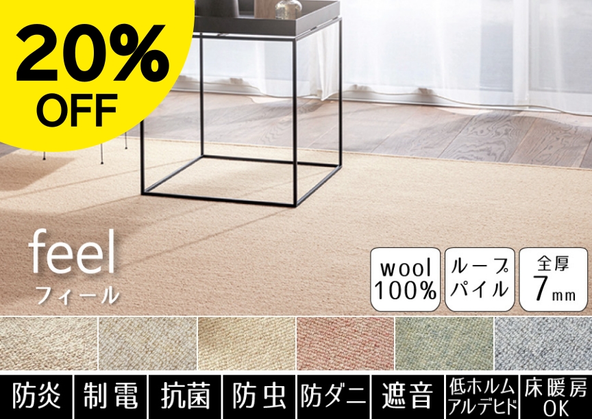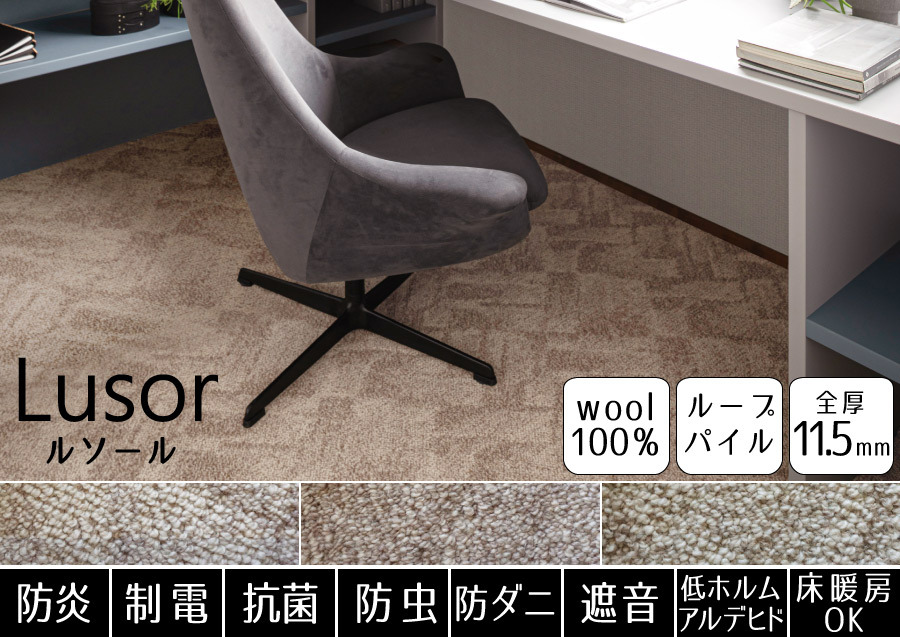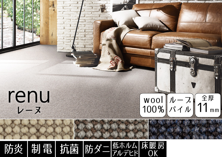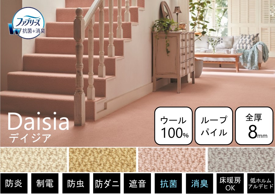 ウールの防汚性と、ファブリーズの消臭・抗菌効果で、クリーンな環境を保ちます。表情豊かなループタイプに仕上げた一枚。