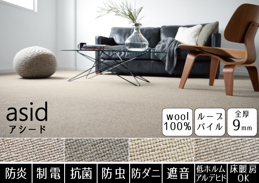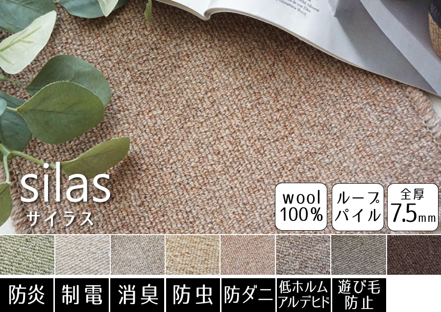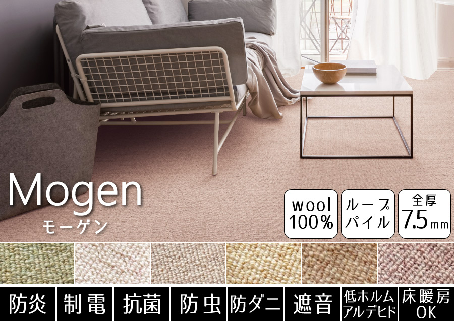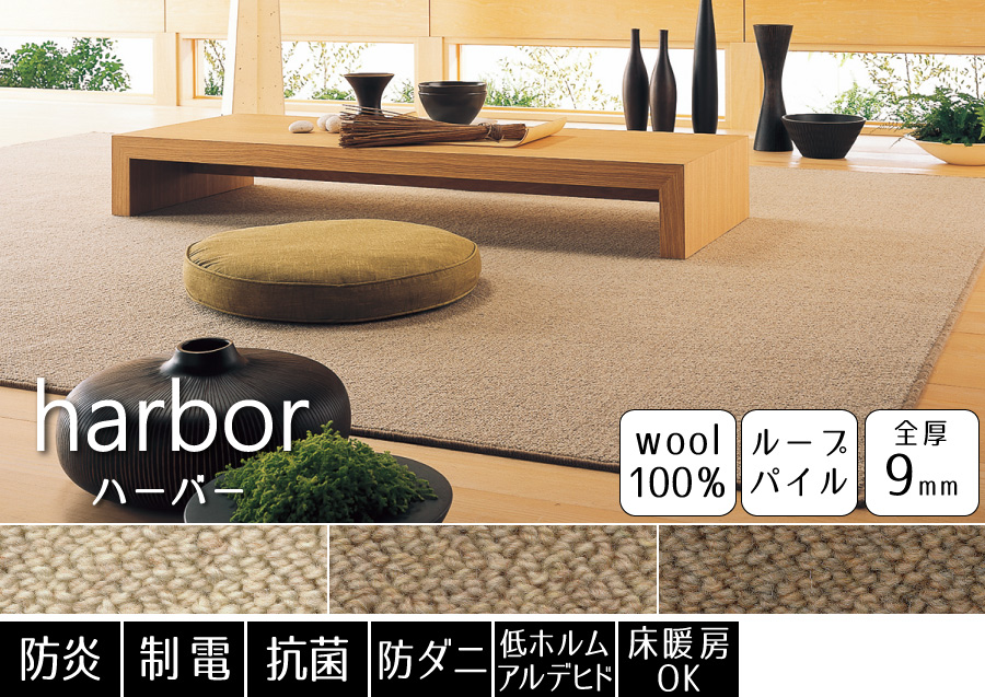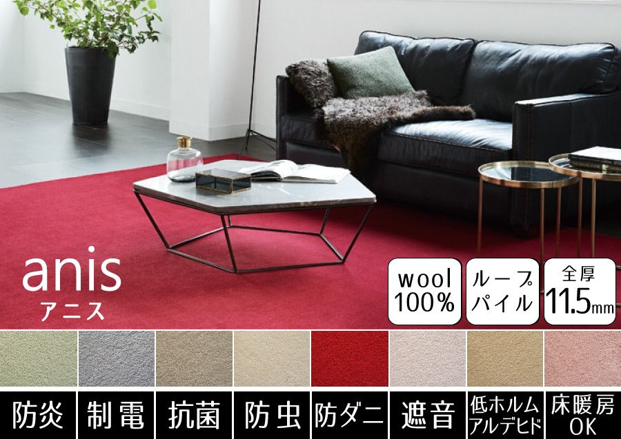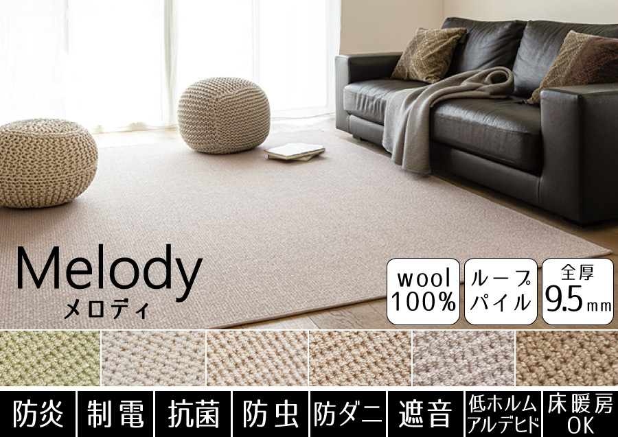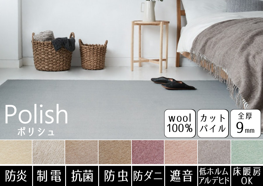 豊富なカラーから選べる!消臭機能付きが嬉しいウールカーペット。防ダニ機能も付いているので、小さなお子様やペットがいるご家庭でも安心