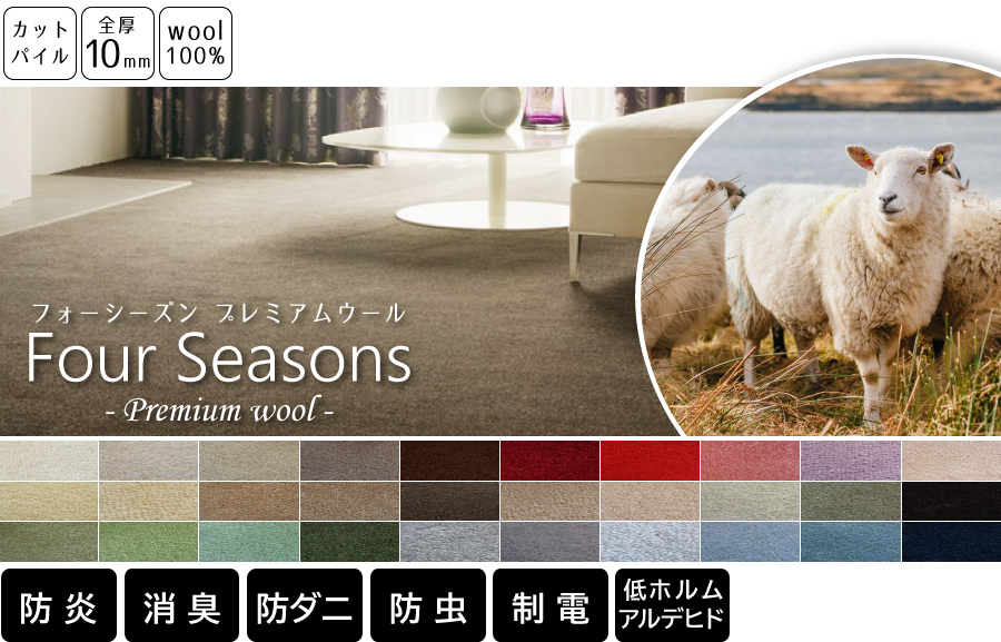 特殊加工によりウールの気になる遊び毛やチクチク感を抑制した一年中心地よくお使いいただけるカーペット
