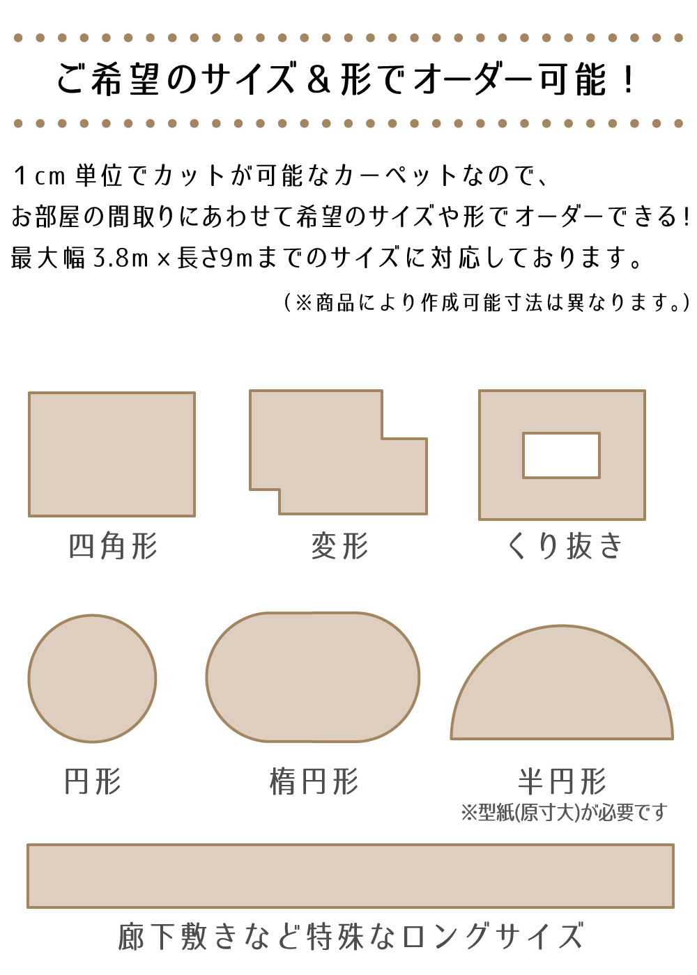 円形や角カット、くり抜きカットなどご希望にあわせて無料でカットオーダーが可能です!