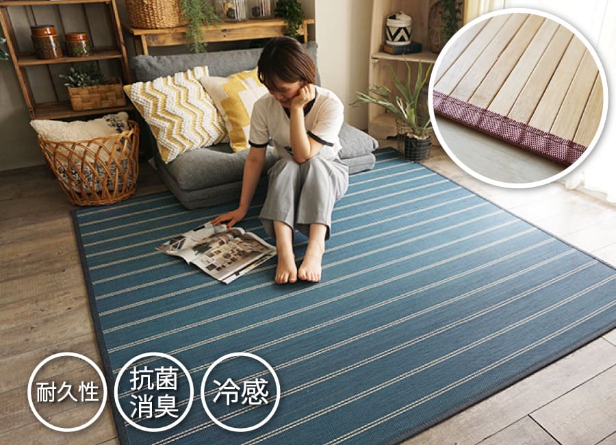 抗菌消臭効果やしなやかな耐久性、熱伝導性が高いため触れるとひんやり冷たく感じるなど、優れた機能を持つ竹ラグは夏にぴったりの素材です。