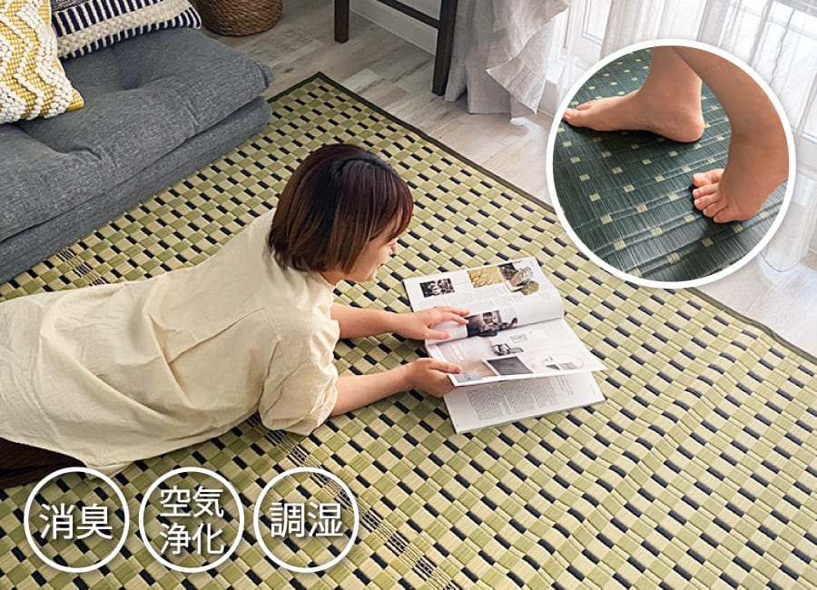 天然素材100%で環境にやさしい草は、お部屋の湿度や温度も調整してくれるので、天然のエアコンと言われているほど万能な素材です!夏はサラッとしたい草ラグで快適に過ごしましょう!